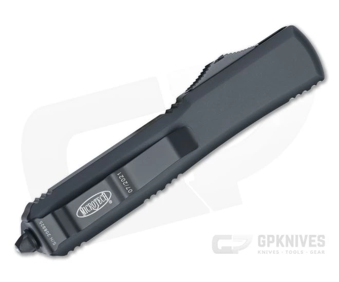 The Ultratech double action out-the-front automatic from Microtech sets the standard for the category. With a sleek durable design, precision American made construction and premium materials, the Ultratech is a perfect everyday carry companion. This Tactical version has a black contoured aluminum handle, matching hardware, and black ELMAX fully serrated Tanto blade.