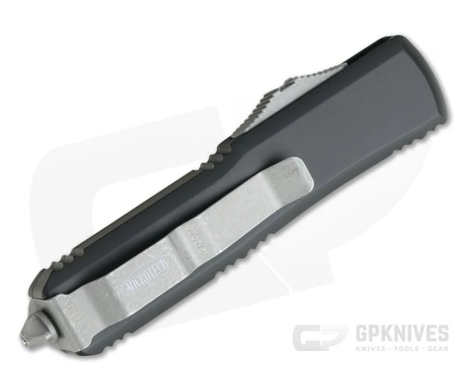 The UTX-85 (15% smaller than an Ultratech or 85% the size of one) double action out-the-front automatic from Microtech is a more compact version of the popular Ultratech making it even better suited to everyday carry. This version has a black contoured handle and partially serrated, Apocalyptic finished, double edge CTS-204P blade.