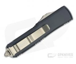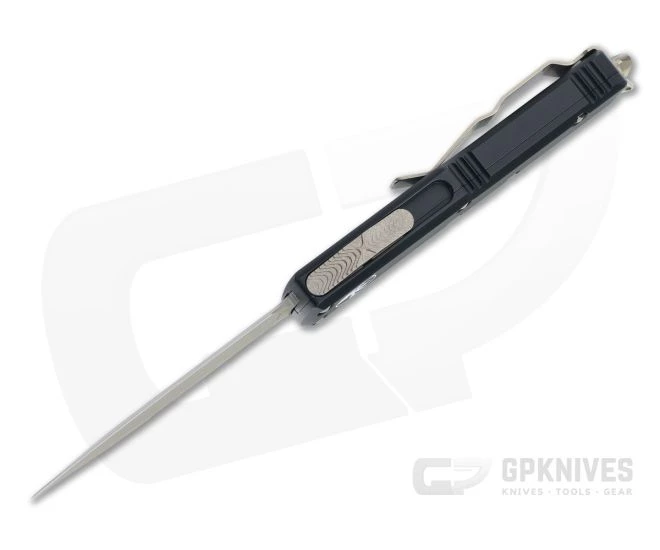 The UTX-85 (15% smaller than an Ultratech or 85% the size of one) double action out the front automatic knife from Microtech makes a more compact, everyday carry option that is as robust and ready for action as its larger counterpart. This version has a black contoured handle and stonewashed bronze M390 double edge blade.