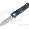 The UTX-85 (15% smaller than an Ultratech or 85% the size of one) double action out the front automatic knife from Microtech makes a more compact, everyday carry option that is as robust and ready for action as its larger counterpart. As part of the Signature Series this “Jedi Master” version has a black textured handle, bronze ringed hardware and green double edge blade.