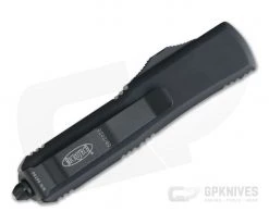 The UTX-85 (15% smaller than an Ultratech or 85% the size of one) dual action out the front automatic knife from Microtech makes an even friendlier every day carry option. This Tactical version has a black contoured handle, black hardware and 2-toned black/satin, partially serrated Drop Point M390 blade.