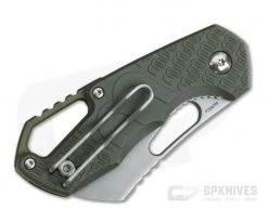 Handle:Â Stainless steel liner construction supports “M” textured, Green FRN handles that are durable, light weight and essentially impervious to the elements. The steel liner lock is secure and reliable with jimping for ease of operation. A Green anodized carabiner/lanyard hole backspacer and pivot collar complement the handles while stainless steel hardware rounds out the construction.