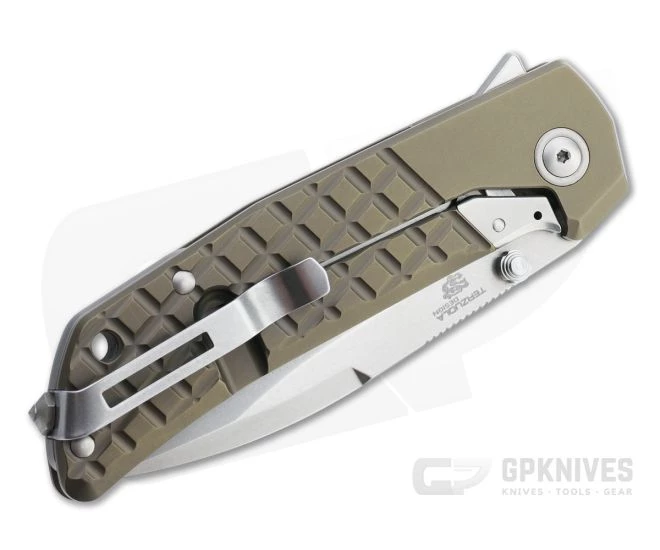 Godfather of the modern tactical flipper, renowned custom knife maker Bob Terzuola has teamed up with MKM and the Mikita network to produce another premium production folder in the Maximo flipper. Built with a robust titanium frame lock construction the Maxmio is a tactical daily carry folder with iconic Terzuola style. This version has a stonewashed M390 spear point blade with bronze anodized titanium frame and front scale and gray pivot collars.