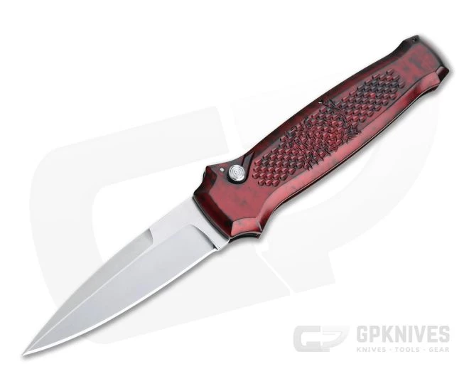 Part of the Bodyguard line from Piranha, the P12 Prowler offers a beefed up version of the dagger-like design with a tougher, 3 mm 154CM spear point blade and thicker handle construction. If you are looking for an automatic backup you can count on, look no further than the Prowler. This version comes with a stonewashed blade and red over black anodized aluminum handle.