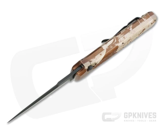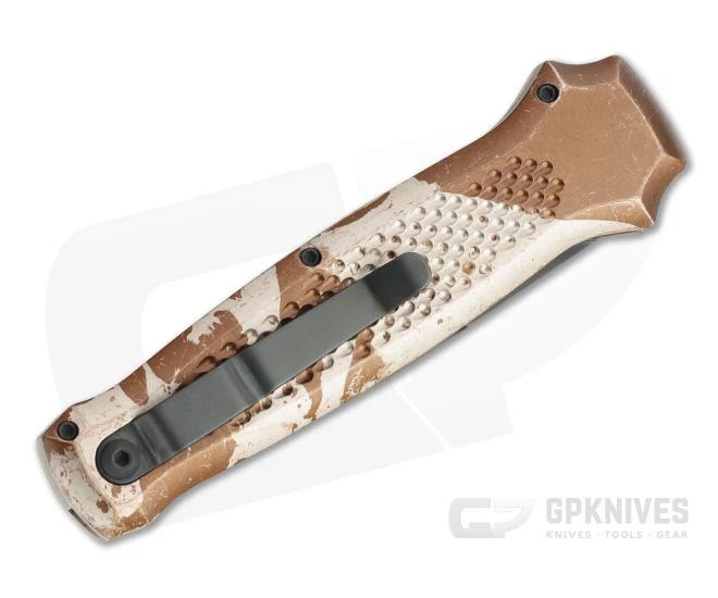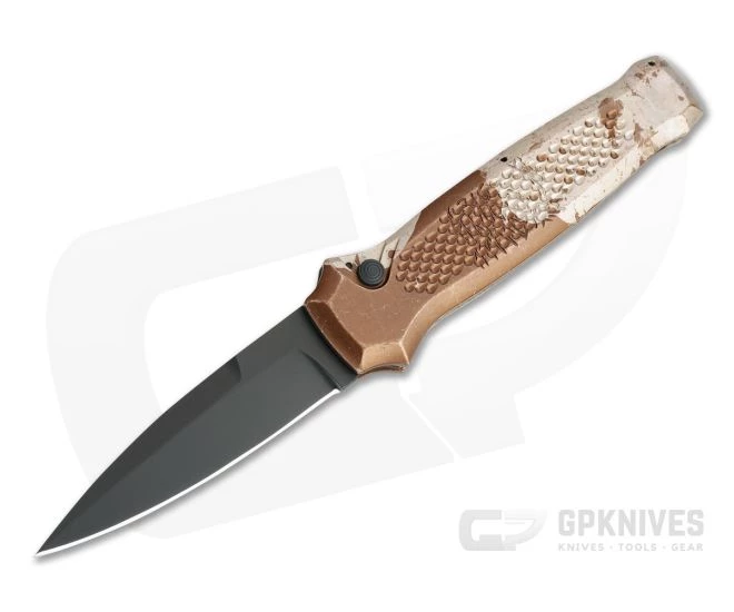 Part of the Bodyguard line from Piranha, the P12 Prowler offers a beefed up version of the dagger-like design with a tougher, 3 mm 154CM spear point blade and thicker handle construction. If you are looking for an automatic backup you can count on, look no further than the Prowler. This Tactical version comes with a black PVD coated blade and Desert Camo anodized aluminum handle.