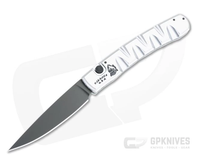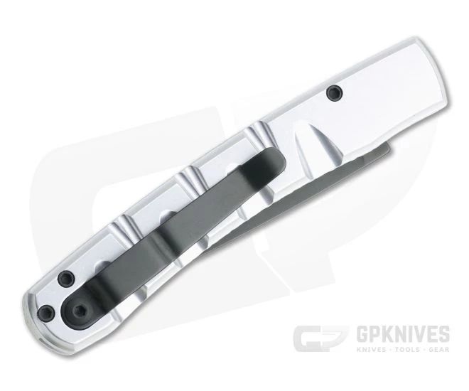 A slim, gentleman’s carry EDC automatic, the Virus from Piranha Knives offers a clean, modern design with high performance materials. Aircraft grade aluminum houses the S30V blade and button lock automatic mechanism for fast deployment and secure lockup. Groove milling on the sides and subtle ridges on the edges gives the knife a secure, comfortable grip. This Tactical version comes with a black PVD coated blade and silver aluminum handle.