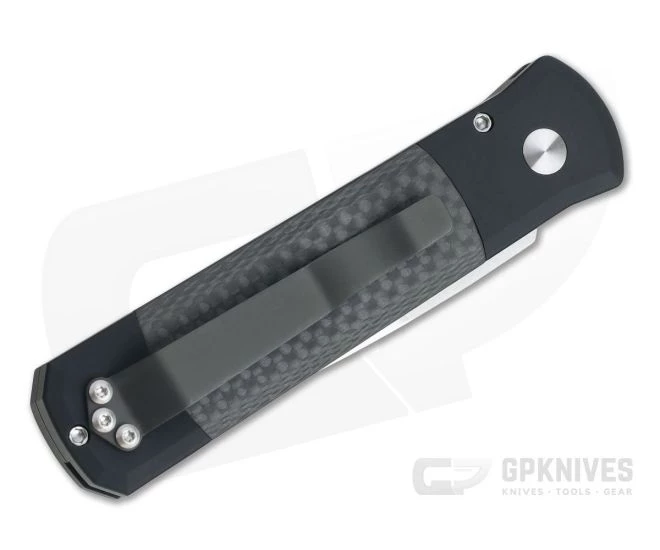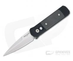The Protech Knives Godson is a classy, compact, every-day-carry version of the Godfather featuring Carbon Fiber inlays. Like the Godfather it retains the classic design lines inspired by traditional Italian folding Stilettos. The Godson also has the same American innovations as the Godfather. This is an automatic Stiletto featuring modern materials, high tech manufacturing, advanced coil spring mechanism, and quality American production. This model of the Godson has a satin finished, plain edge blade and Black Hard Anodized aluminum handles with stylish Carbon Fiber inlays.