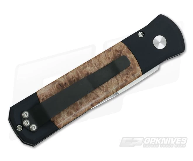 The Protech Knives Godson 706 is a classy, compact, every-day-carry version of the Godfather featuring Maple Burl inlays. Like the Godfather it retains the classic design lines inspired by traditional Italian folding Stilettos. The Godson also has the same American innovations as the Godfather. This is an automatic Stiletto featuring modern materials, high tech manufacturing, advanced coil spring mechanism, and quality American production. This model of the Godson has a satin finished, plain edge blade and Black Hard Anodized aluminum handles with stylish Maple Burl wood Inlays.Â