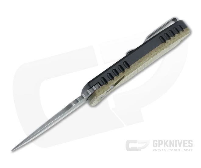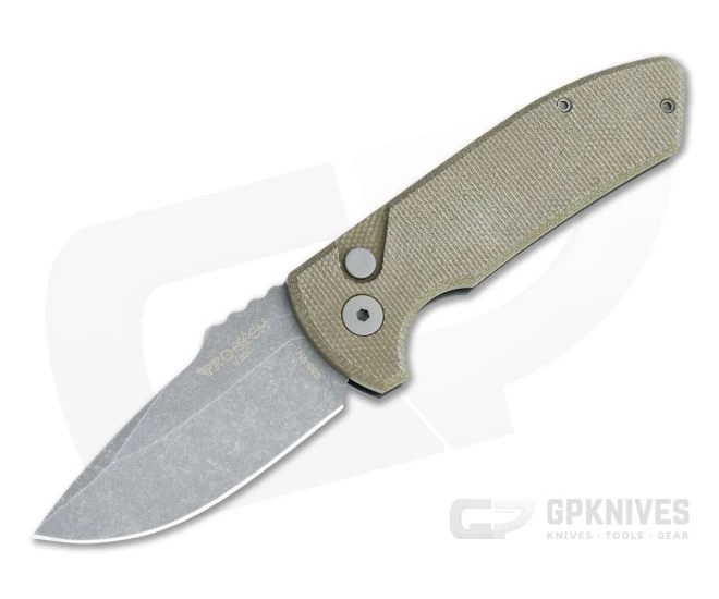 The Protech Knives SBR (Short Bladed Rockeye) is a utilitarian, compact, every-day-carry version of the Les George iconic Rockeye model, retaining the classic design in a smaller package. The SBR has the same American innovations as the Rockeye, featuring modern materials, high-tech manufacturing, advanced coil spring mechanism, and quality American production. This GPKnives Exclusive version has an acid washed S35VN blade, smooth black aluminum frame and Green canvas Micarta top.
