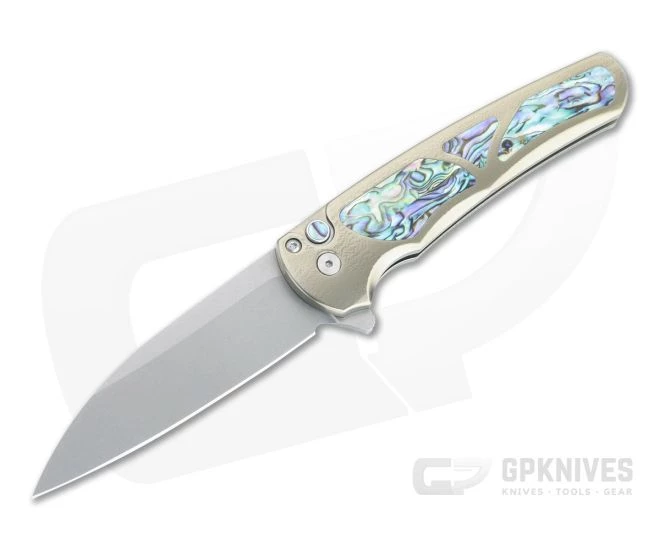 Handle:Â Made from solid titanium, the handles are 3D milled with a subtle orange peel texture for visual appeal with a bronze anodized finish and stunning abalone inlays. Subtle finger grooves give optimal comfort with enhanced ergonomics and a distal taper that locks the hand in behind the integral flipper tab guard. The inlaid button lock adds a custom touch and delivers smooth operation and solid lockup. Construction is completed with satin hardware and a solid blue anodized titanium back spacer.
