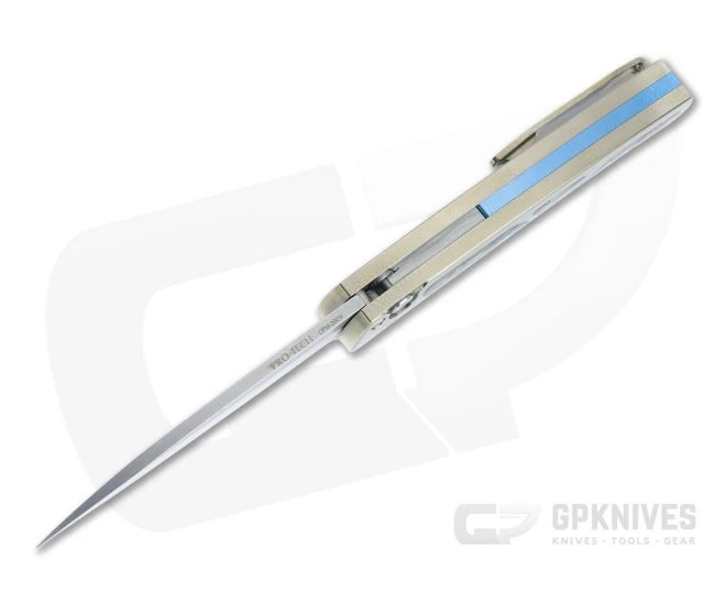The Protech Knives Malibu is a manual flipper happy to join the Protech family and sports a fast and fluid, flipper deployment and button lock mechanism. This slim folder exhibits all the precision fit and finish we know and love from Protech automatics delivered in a quick operating manual folder. Great for everyday carry and an ideal gentleman’s tactical option. This titanium custom version comes with a stonewashed CPM-20CV modified Wharncliffe blade, bronze anodized 3D milled titanium handles with abalone inlays, matching inlaid button, solid titanium and 3D titanium pocket clip.