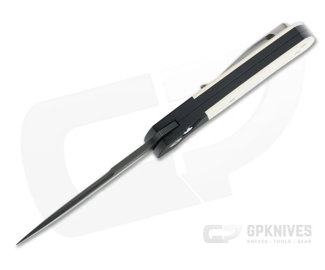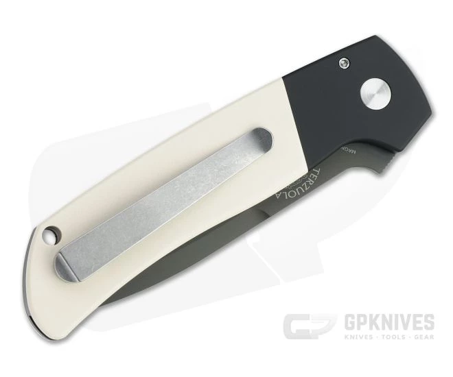 Handle:Â Dual slabs of black hard anodized aluminum form the frame and integral bolsters supporting precision fit ivory Micarta scales for a premium look and feel. The large handle offers a full grip with a subtle ergonomic design that is comfortable in multiple positions. The milled stonewashed titanium clip gives added traction, perfect for the strong automatic blade deployment while the button lock provides strong, secure lockup for safe use.