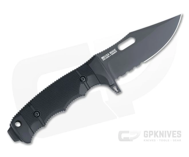 The Award Winning, USA-made SOG Seal FX is a large, high performance, full tang fixed blade version of the popular SOG XR folder design. You get the same durable, high traction polymer handles and high quality stainless steel blade in a more robust fixed blade platform with a well-designed sheath system for multiple secure carry options. This version comes with a black GRN handle and a Black Cerakote coated CPM-S35VN, partially serrated clip point blade.