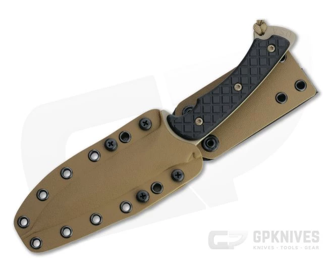 The Spartan Blades Ares Fighter/Combat Utility fixed blade personifies its namesake: Ares the Greek God of War. This warrior was brought to life for use by and with input from the US Special Forces. It utilizes a saber ground, drop point blade for strength and durability in all conditions while checkered Micarta scales and a notched thumb ramp provide a superior grip. The angled handle enhances the ergonomics as well as efficient power transfer during martial use. This version comes with a Flat Dark Earth coated CPM-S45VN blade, black canvas Micarta handle scales and tan Kydex sheath.