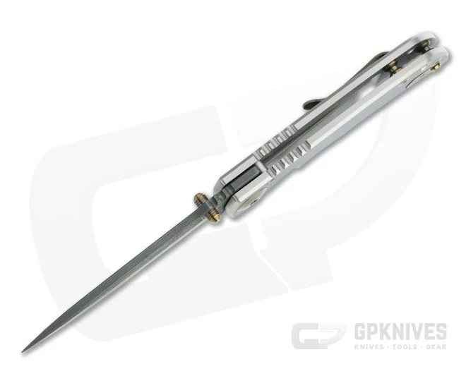 Blade:Â Coming in at just under 3.25 inches, the classic drop point blade is made from Nichols stainless Damascus with a top swedge and high saber grind for strength balanced with daily carry performance. Acid etched to bring out the unique look of the pattern welded steel, the blade offers an eye-catching look with modern performance. Deployment is smooth on durable bronze washers via dual titanium thumb studs. Aggressive jimping on the thumb ramp offers added traction and a point for indexing.