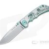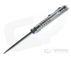 Handle: Ergonomic handles have been constructed from finely brushed satin 6AL4V titanium with detailed engraving. The show side has a black Kraken, clipper ship and ocean waves engraved on the front along with a “Spartan” engraved clip insert. On the reverse side engraved is a closeup of the Kraken on its own. Blue anodized titanium barrel spacers, hardware and oversize pivot bring the two pieces together. The back titanium slab forms an integral frame lock mechanism for reliable lock-up in hard use conditions with oversized pivot lockbar stabilizer.
