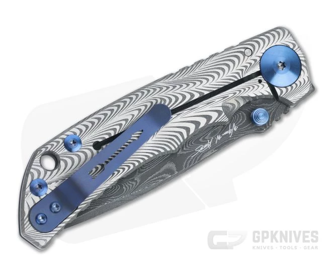 Blade:Â A traditional drop point style blade has dual blue anodized titanium thumb studs making opening from either side a breeze. Bronze washers construction at pivot delivers smooth operation of the blade with zero play. Chad Nichols Stainless Damascus steel delivers modern performance with a striking and unique visual appeal for this custom, tactical folder. Jimping along the thumb ramp adds traction for serious use.