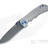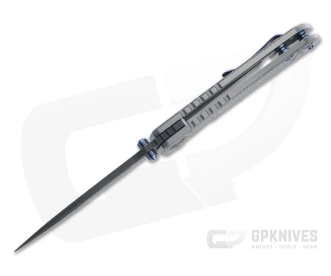 Handle: Ergonomic handles have been constructed from satin rub finished 6AL4V titanium with laser engraved sound wave pattern on both front and back. Freshly blue anodized hardware complete the construction. The back titanium slab forms an integral frame lock mechanism for reliable lock-up in hard use conditions with oversized pivot lockbar stabilizer.