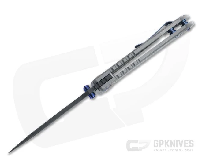 Handle: Ergonomic handles have been constructed from satin rub finished 6AL4V titanium with laser engraved sound wave pattern on both front and back. Freshly blue anodized hardware complete the construction. The back titanium slab forms an integral frame lock mechanism for reliable lock-up in hard use conditions with oversized pivot lockbar stabilizer.
