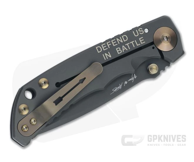 Blade:Â A classic, utilitarian drop point blade is made from CPM-S45VN with a top swedge and high saber grind for balanced performance and durability. Durable black PVD coating on the blade hides wear, resists corrosion and is discreetly non-reflective. Riding on reliable bronze washers the blade deploys fast and smooth via dual bronze titanium thumb studs. Aggressive jimping on the thumb ramp offers added traction and a point for indexing.