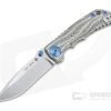 Handle: Ergonomic handles have been constructed from 6AL4V titanium with deep engraved graphics, a two-tone brushed and blue anodized finish, matching hardware and Spartan engraved clip insert. The back titanium slab forms an integral frame lock mechanism for reliable lock-up in hard use conditions. Custom anodized titanium barrel spacers, handle screws and oversized pivot/over travel stop complete the construction.