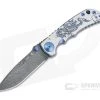 Blade:Â A classic, utilitarian drop point blade is made from Nichols stainless Damascus with a top swedge and high saber grind for balanced performance and durability. Acid etched to bring out the unique look of the pattern welded steel, the blade offers an eye-catching look with modern performance. Riding on rugged bronze washers the blade deploys fast and smooth via dual titanium thumb studs. Aggressive jimping on the thumb ramp offers added traction and a point for indexing.