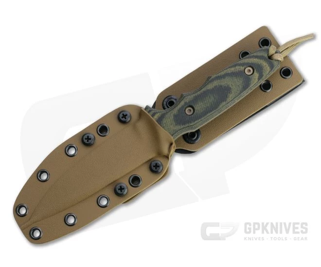 Handle:Â The full tang extends through two contoured and micro-textured linen Micarta handle scales delivering a comfortable and ergonomic grip. The neutral design allows for multiple grips, versatile in utility and defensive use. An attached paracord lanyard provides added safety in use.