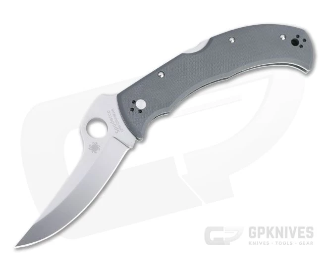 Originally released in 2001 the distinctive Spyderco Massad Ayoob folding knife bears the name of its designer and has a striking look that is pragmatic in design. The negative angle aligns the blade with the forearm for more efficient energy transfer during use while shortening the opening arc. By popular demand the Ayoob is back as a limited production Sprint Run with a CPM-Cruwear tool steel blade with distinguishing gray G10 handle scales. This version comes with a plain cutting edge.