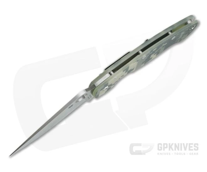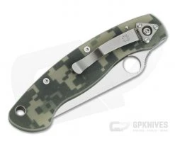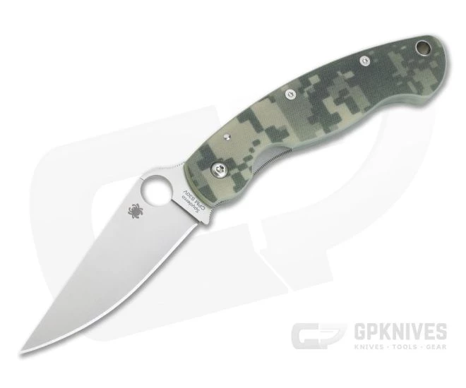 Designed by Sal Glesser to meet the requirements of a high-performance, light-weight folder designed for hard use the Spyderco Military was an answer to the question: “If your son were going into the military what folding knife would you send him with?” The precursor to the popular EDC Paramilitary 2, the Military has a similar clip point blade with large 14 mm Round Hole for ease of operation with gloves and a jimped choil and thumb ramp for optimal control. Nested, skeletonized stainless steel liners support G10 scales for a solid balance of lightweight durability and ease of maintenance. Where ever life may take you the Spyderco Military is a folding knife you can count on. This version comes with Digi Camo G10 handle scales and a satin finished, plain edge, CPM-S30V stainless steel blade.