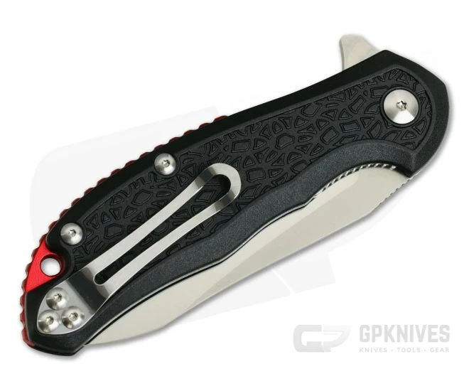 Handle:Â Lightweight fiberglass reinforced nylon is textured for grip but smooth and contoured around the edges for comfort during use. The classic black FRN captures a jewel red anodized aluminum backspacer that has jimping along the spine in increase traction in the hand. Nested steel liners are skeletonized for further weight reduction and form a liner lock mechanism that offers smooth operation and secure lock-up of the knife.