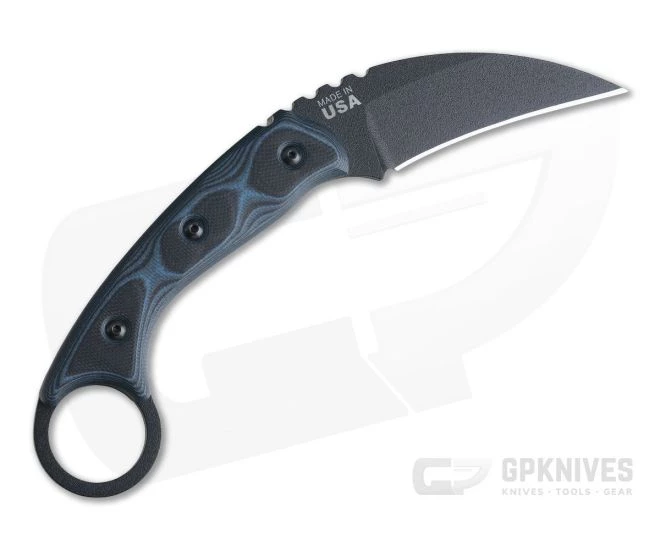 TOPS designed with optimal concealment in mind, the Original Devil’s Claw has a purposefully short handle and foregoes the traditional Karambit ring. Reminiscent of traditional Karambits it was only a matter of time before the Devil’s Claw was modified into one. Enter the Devil’s Claw 2. The classic hawk bill blade shape is time tested for utility and martial use. The Devil’s Claw 2 has a longer handle with that traditional end ring offer the ability to utilize traditional Karambit techniques while sacrificing some of the concealability of the original. This version comes with the classic Black Traction Coating and Blue & Black layered G10 handles.