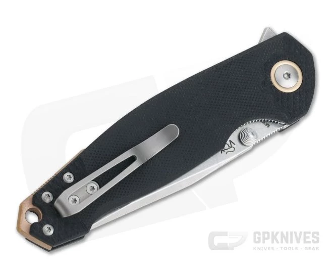 Handle: Dual, stainless steel liners support durable, weatherproof Black G10 handle scales with 3D machined texture details at either end. With clean, simple and ergonomic lines these handles are classic Voxnaes design and feel great in the hand. A deep index cut out pairs with the flipper tab guard to offer excellent security while providing access to the smooth and reliable liner lock mechanism. CNC machined phosphor bronze is used for the pivot collars are partial back spacer for a subtle visual contrast. A generous hole is provided in the back spacer for lanyard attachment.